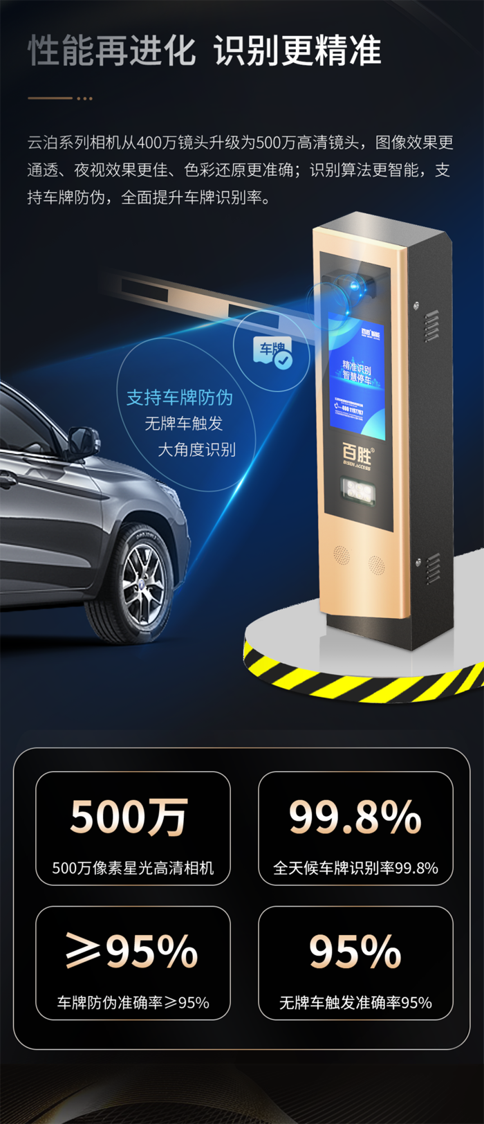 雲泊係(xì)列相機從400萬鏡頭升級為500萬高清鏡頭,圖像效果(guǒ)更通透、夜視(shì)效果更佳、色彩還原更準確(què);識別算(suàn)法更智能,支持車牌防偽,全麵提升車牌識別率(lǜ)。