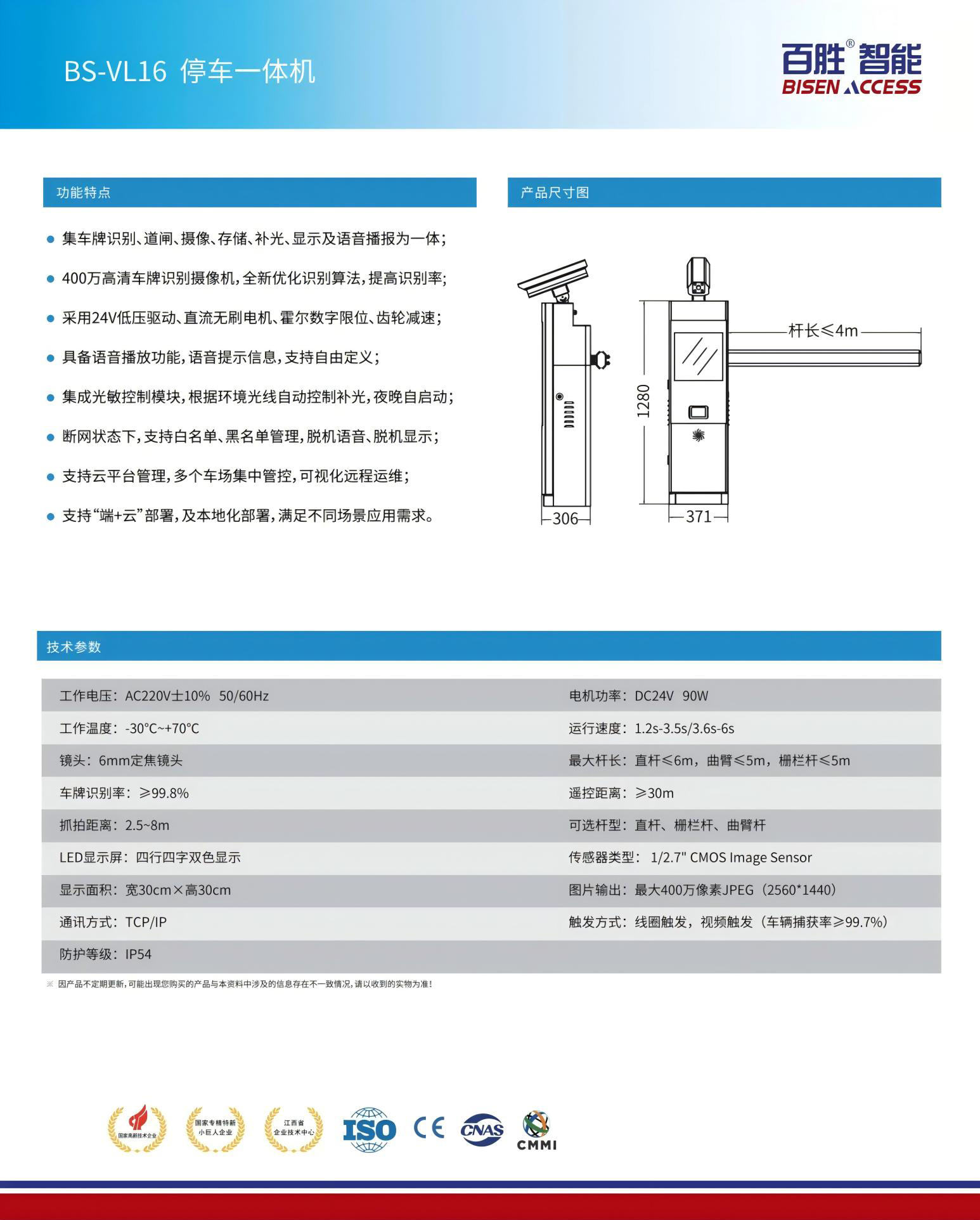 ●集車牌識別、道閘、攝像、存(cún)儲、補光、顯示及語(yǔ)音播報為一體;