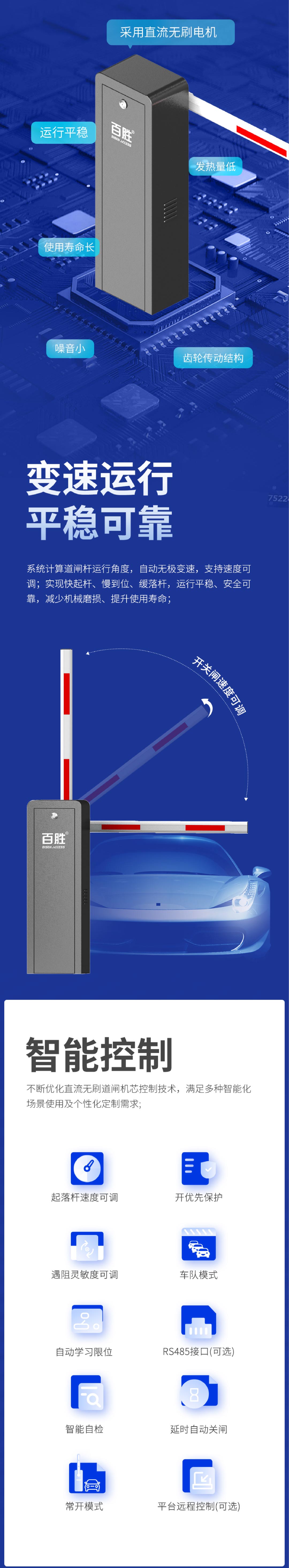 係統計(jì)算道閘杆運行角度,自動無極變速,支(zhī)持速度可調;實現快起杆、慢到位、緩落杆,運行平穩、安全可靠(kào),減少機械磨(mó)損、提升使(shǐ)用壽命(mìng);